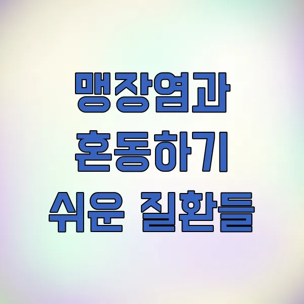 맹장염의 증상은 다른 질환과 유사하게 나타날 수 있어 혼동하기 쉽습니다. 예를 들어, 여성의 경우 난소 낭종 파열이나 자궁외 임신 등 부인과 질환과 증상이 비슷할 수 있습니다.